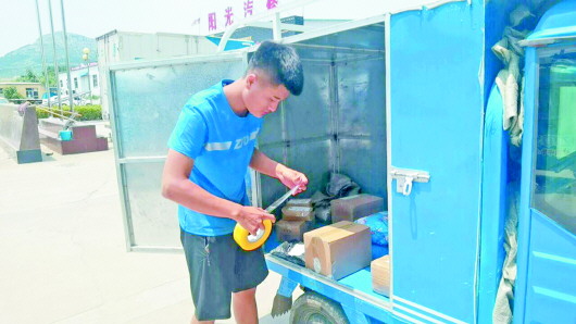 张作斌开着一辆电动三轮车,简陋的车内没有小风扇,1.5升的塑料杯放在了座位下面,水只剩下一个瓶底。“我早上出发时灌上一瓶子水,中午回来一般就喝完了,等下午出发时再灌上一瓶。”张作斌说,自己一天能送150多个件。