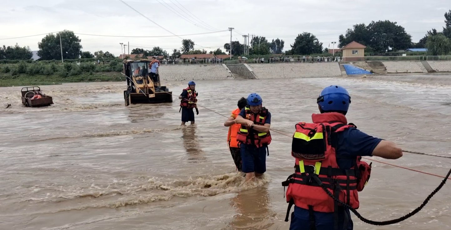 8月5日,烟台普迎降雨,部分河道水位迅速上涨。当日10时17分,一辆三轮车和一辆铲车在莱州市的一处漫水桥上涉水行驶时,由于水流湍急,被冲入河中。三轮车和铲车上分别有2人被困于河中央。接到求助后,烟台市消防救援支队莱州大队森林中队和云峰路消防救援站立即出动前往救援。